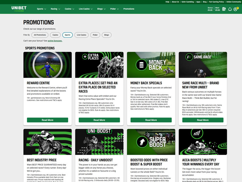 Their deposit bonus may be small, but Unibet does make up for it with other promotions. Their offers are like many bookies that are much larger than them. However, many of the promotions centre on popular UK & Irish Sports, but you will occasionally get offers elsewhere.